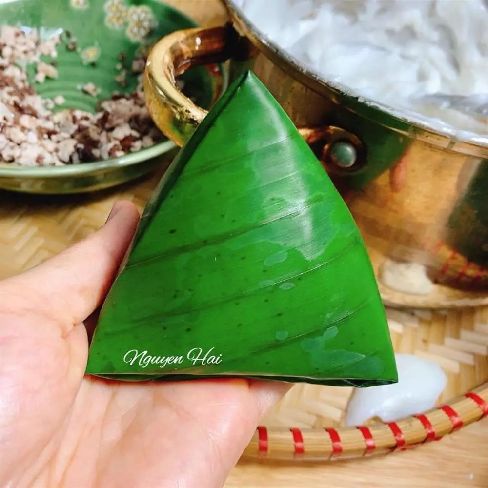 Lá chuối rửa sạch trần qua nước sôi (cho lá mềm lại dễ gói hơn) rồi lau khô.