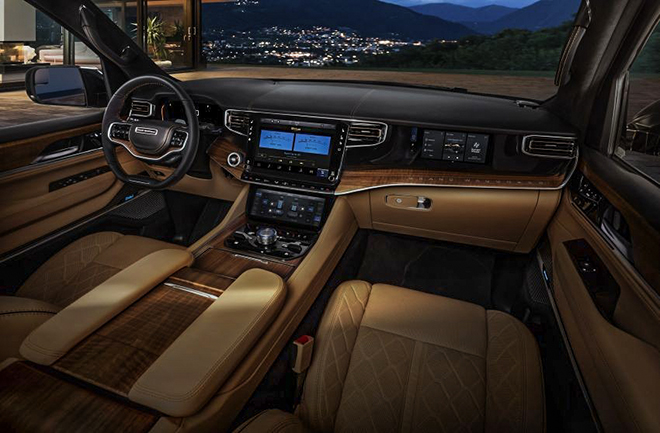 Bên trong xe là không gian nội thất về cơ bản là giống nhau. Cả hai mẫu xe này đều được trang bị mặt táp-lô hình đôi cánh, cụm điều khiển trung tâm rộng, núm xoay chọn số bằng nhôm và vô lăng 2 chấu. Nếu như Jeep Wagoneer 2022 được bọc da Nappa thì Grand Wagoneer lại dùng da Palermo khâu quả trám.