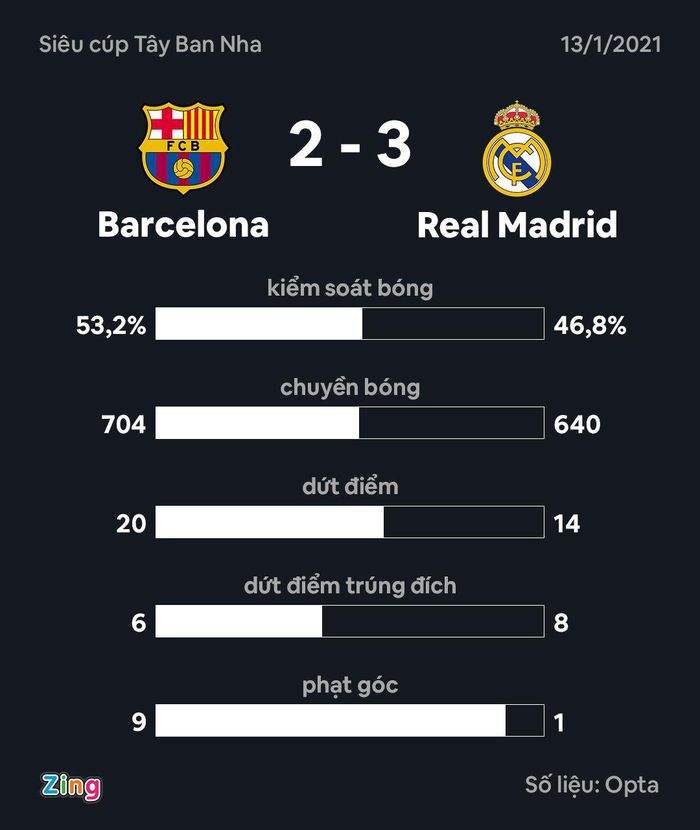 Barca đã thi đấu đầy cống hiến. Đoàn quân của HLV Xavi Hernandez đã thực hiện đến 20 cú sút (6 trúng đích), thống kê tốt nhất của đội bóng xứ Catalonia ở trận Siêu kinh điển kể từ tháng 4/2006 (35 cú sút ở trận đấu tại La Liga).