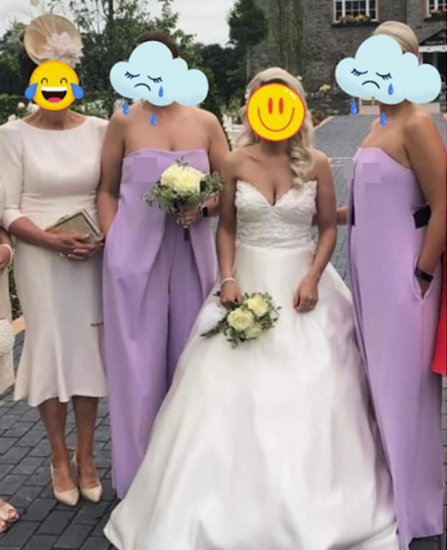 Cô dâu trong bức ảnh này đă lên tiếng nhờ cư dân mạng photoshop chỉnh sửa váy của hai người họ hàng để cho chúng trông kín đáo hơn.