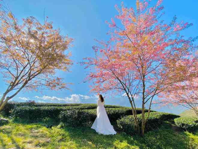 Đồi chè Ô Long là một trong những địa điểm ngắm mai anh đào đẹp ở Việt Nam. Ảnh: dulichchat
