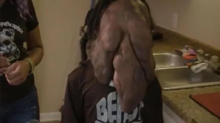 Các khối u trên mặt cậu bé ngày càng trở nên tồi tệ hơn khi trưởng thành và chúng bắt đầu cản trở tầm nhìn. Kandice giải thích rằng hiện tại cậu bé chỉ có thể nhìn thấy bằng mắt phải vì khối u trên mặt.