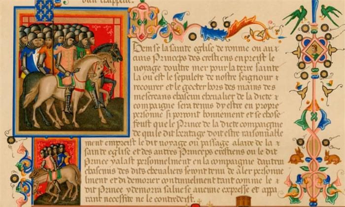 Trang bản thảo mô tả những con ngựa chiến to lớn trong các cuộc thập tự chinh, bằng tiếng Pháp cổ.