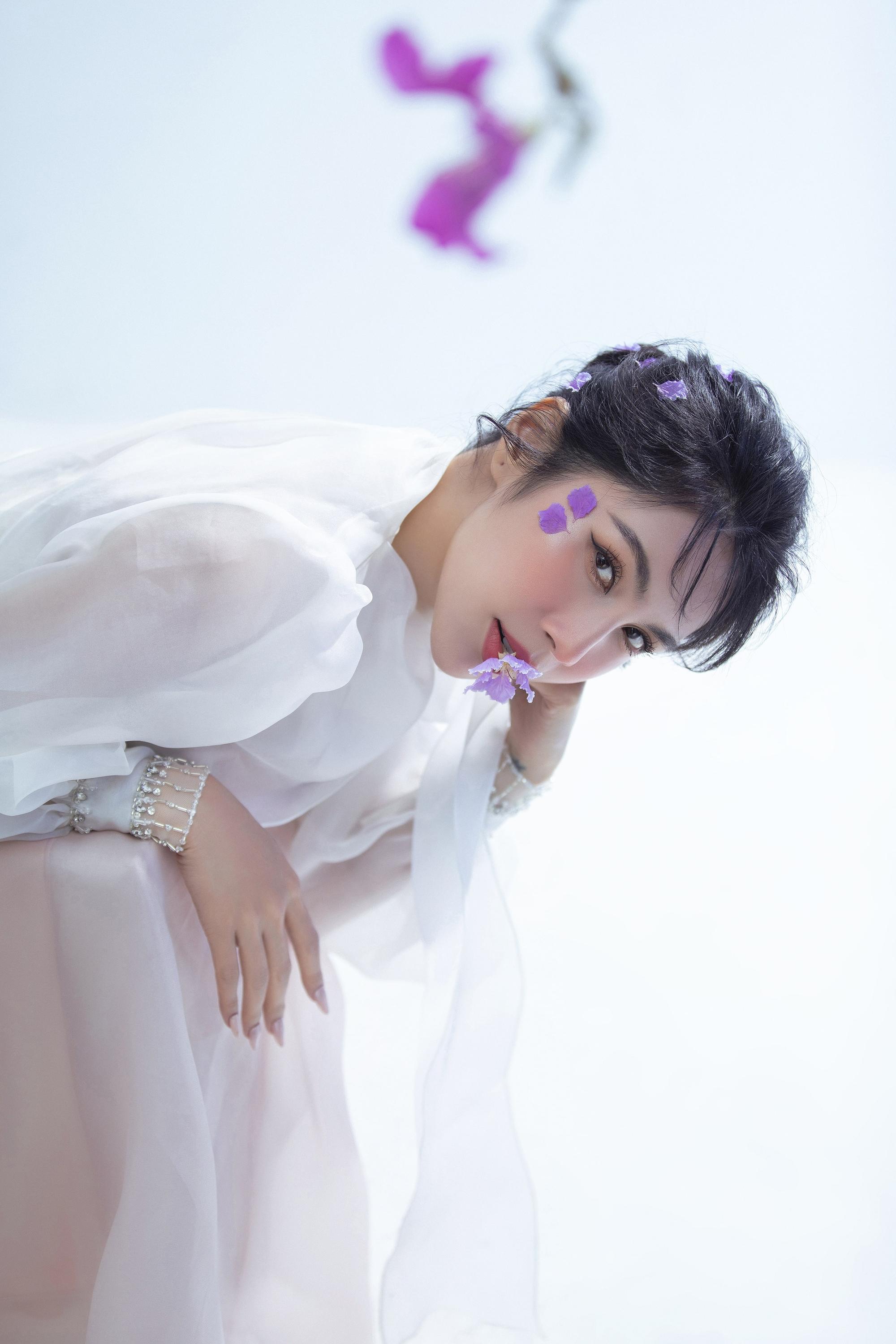 Sở hữu vẻ đẹp mong manh, nữ ca sĩ rất hợp với tone trang điểm trong, nhẹ, tự nhiên. Tạo hình cùng những cánh bằng lăng tím mọng, bộ ảnh dường như thay nữ ca sĩ nói lên nhiều điều.
