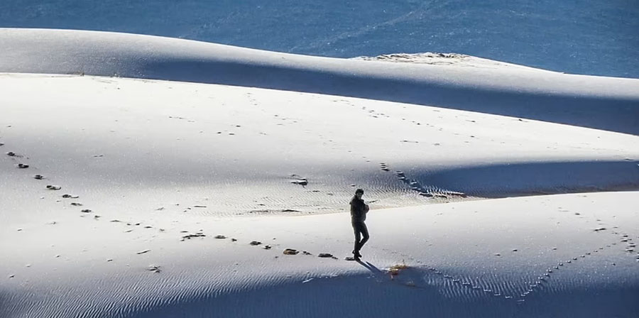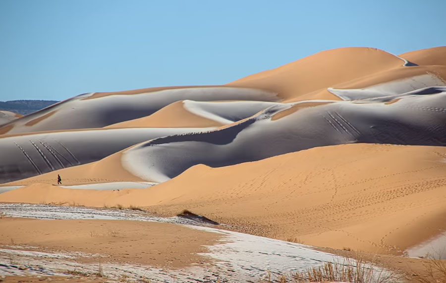 Tuyết rơi, băng phủ trên các cồn cát là một hiện tượng hiếm gặp ở sa mạc lớn nhất thế giới – Sahara, nơi luôn có nhiệt độ cao lên tới 58 độ C.