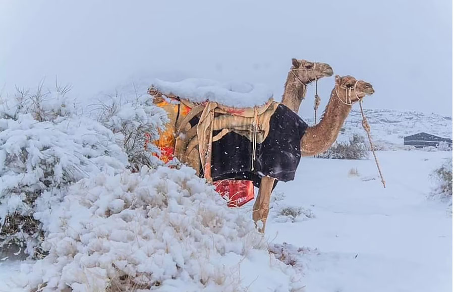 Năm ngoái, người ta nhìn thấy những con lạc đà bị tuyết bao quanh khi Bắc Phi bị bao phủ bởi nhiệt độ khắc nghiệt trong những tháng mùa hè và mùa đông.