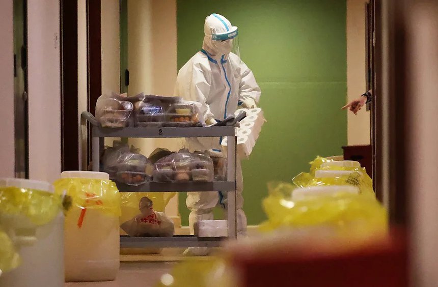 Một tình nguyện viên đang phân phát thức ăn nhu yếu phẩm bên trong khách sạn Shuanglong, nơi được dùng làm cơ sở cách ly trong thời gian diễn ra Olympic Bắc Kinh 2022. Ảnh: Getty.