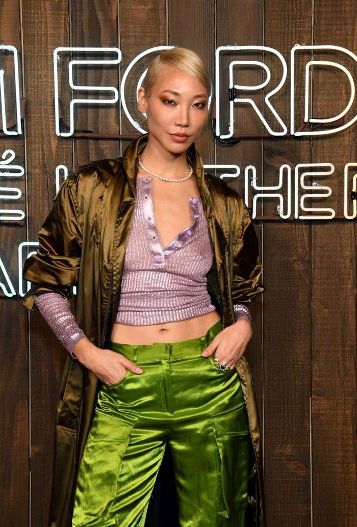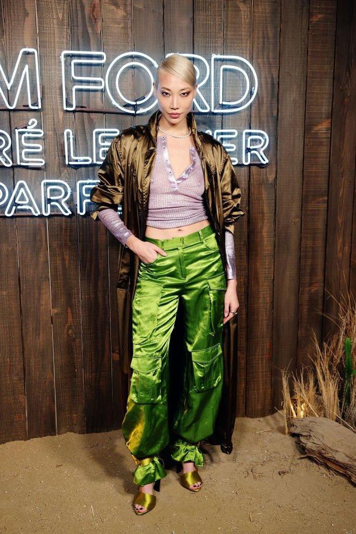 Nhờ sự lăng xê của dàn sao nổi tiếng, những món đồ bình thường cũng trở thành khoảnh khắc thời trang đáng nhớ. Rihanna, Emily Ratajkowski, Zendaya và Soo Joo Park gần đây chứng minh những chiếc quần chở hàng (cargo pants) cũng có thể giúp người mặc trông quyến rũ, Vogue bình luận. Tom Ford đã xóa bỏ quan niệm cho rằng quần túi hộp phải được làm từ chất liệu vải thô cứng bằng cách làm ra thiết kế màu xanh lá cây Soo Joo Park. Ảnh: Rich Fury.