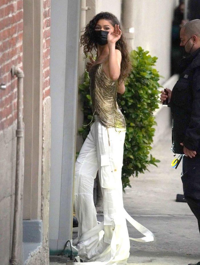 Balmain gần đây ra mắt thiết kế có chi tiết dây đai dài nổi bật. Thay vì phối đồ theo phong cách năng động, Zendaya chọn kết hợp với áo hai dây lấp lánh, mang đến cái nhìn gợi cảm. Ảnh: Star Max.