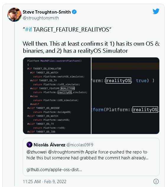 Nhà phát triển Steve Troughton-Smith đã phát hiện ra tên của hệ điều hành riêng biệt mà Apple âm thầm phát triển đó chính là “realityOS”. Đây là một hệ điều hành hoàn toàn mới và đi kèm với một trình giả lập dành cho các nhà phát triển.