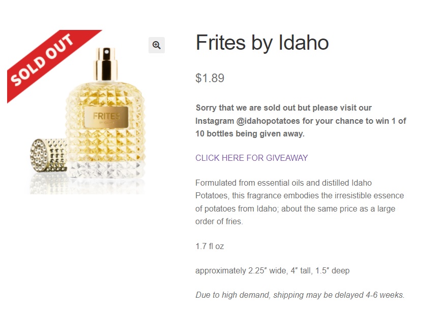 Sản phẩm đã hết hàng nhanh chóng trên website, tuy nhiên người dùng mạng xã hội vẫn có thể tham gia give away trên Instagram để có cơ hội nhận nước hoa miễn phí (Ảnh: Idaho Potato Commission)