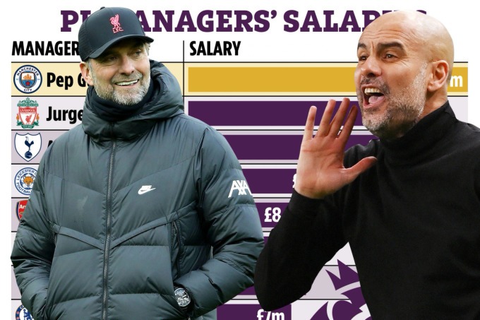 Guardiola và Klopp đứng đầu bảng lương của giới HLV tại Ngoại hạng Anh. Ảnh: Sun