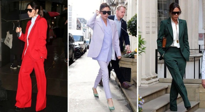 Victoria không g̣ bó bản thân trong những bộ suit công sở nhàm chán. Cô thể hiện tuyên ngôn thời trang thông qua các kiểu suit với màu sắc nổi bật như hồng, vàng, tím, xanh... Nhà thiết kế cũng thường chọn dáng suit suông rộng đậm chất menswear, không bao giờ lỗi mốt.
