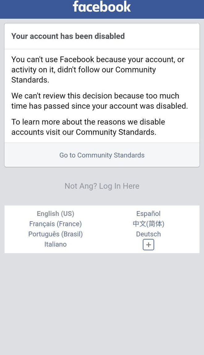 Điều bất ngờ là trước đó, họ cũng không hề nhận được cảnh báo cũng như những giải thích nào liên quan.“Tài khoản Facebook của tôi đã bị khoá vì lý do được cho là không tuân theo các tiêu chuẩn cộng đồng,” một người dùng Facebook bực dọc viết trên Twitter. “Tài khoản chỉ là bị khoá mà không cho kháng cáo, không có bất kỳ lời giải thích gì thêm."