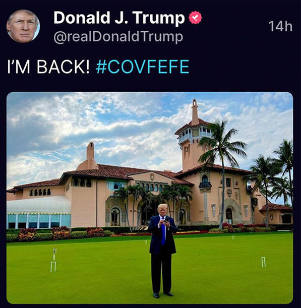 Đến ngày 29/4, ông Trump đăng thông điệp ngắn lên Truth Social: "Tôi đã trở lại". Đây là lần đầu tiên ông xuất hiện trên mạng xã hội do chính mình lập ra kể từ khi ra mắt hồi tháng 2. Bài viết lập tức thu hút 300.000 lượt thích và 100.000 lượt chia sẻ.