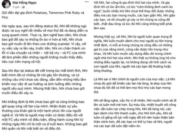Cô chia sẻ: “Không bao giờ Nhi quên và Nhi mãi biết ơn về điều đó. Với Nhi, fan cũng là gia đình thứ hai của mình. Và gia đình thì có lúc ấm êm, có lúc “cơm không lành canh không ngọt”, buồn nhiều khi Nhi chưa thể thay đổi được những điều mà các bạn mong muốn, các bạn giận Nhi, Nhi giận các bạn và rồi chuyện gì xảy ra thì chúng ta cũng đã biết… Thật đau lòng và lúc đó Nhi cũng không biết phải làm sao”.