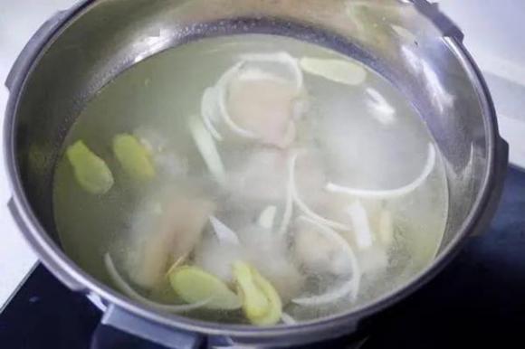 3. Chuẩn bị một nồi, cho nước lạnh vừa đủ vào nồi, cho chân giò đã rửa sạch vào nồi, thêm rượu nấu ăn và gừng thái sợi vào, vặn nhỏ lửa, đun sôi.