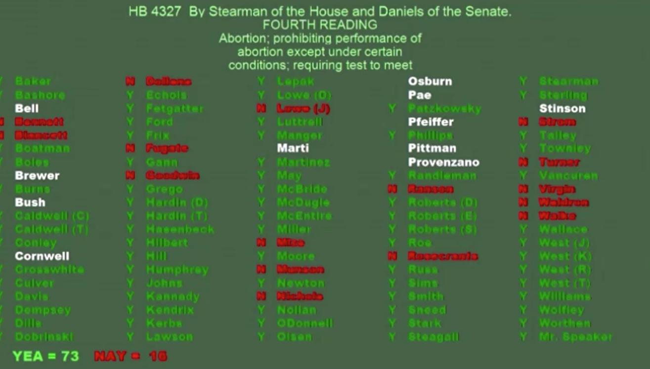 Các nhà lập pháp Oklahoma hôm thứ Năm (19 tháng Năm) thông qua bước cuối của một dự luật cấm phá thai, theo đó cấm hầu như tất cả các hình thức phá thai và cho phép người dân kiện bất kỳ ai giúp phụ nữ phá thai.