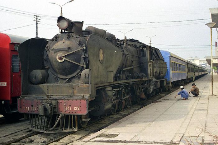 Đầu máy Tự Lực số 141-122 tại ga Hà Nội năm 1996. Đây là dòng đầu máy chạy bằng hơi nước, đốt than được đóng theo kiểu dáng công nghệ của thương hiệu đầu máy Pháp Mikado, thập niên 1960. Ảnh: Ian Lynas Flickr.