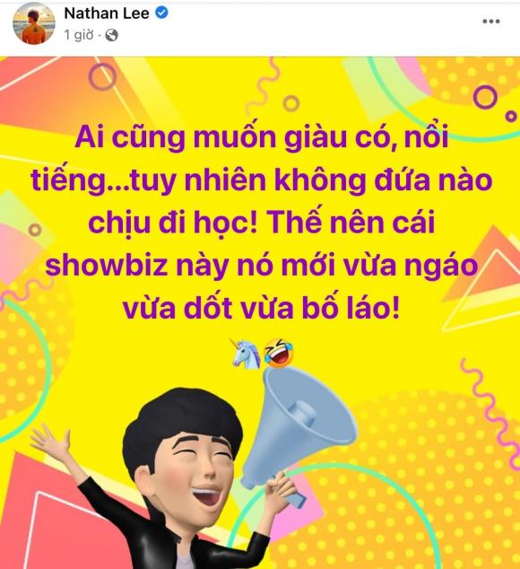 Đầu tiên, Nathan Lee viết ngắn gọn ba chữ: "Thương Lâm Đồng" như nói lên hết thái độ khinh khi của anh dành cho gà cưng của Khắc Tiệp vì mượn địa danh này để bày trò ''nổ''. Tiếp theo, nam ca sĩ gắt hơn khi cho biết trong showbiz có "nhiều đứa" ham nổi tiếng thích khoe giàu có nhưng lại không chịu học thêm kiến thức nên trở thành lố bịch trong mắt công chúng: "Ai cũng muốn giàu có, nổi tiếng... Tuy nhiên không đứa nào chịu đi học! Thế nên cái showbiz này nó mới vừa ngáo vừa dốt vừa bố láo!". Dù không chỉ đích danh nhưng cư dân mạng đều hiểu đối tượng mà nam ca sĩ muốn đề cập là ai.