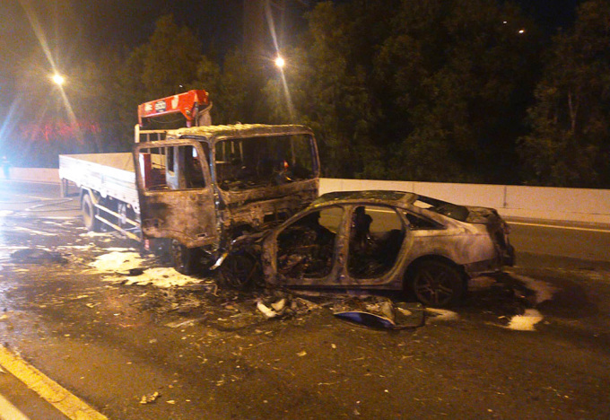 Cú va chạm mạnh khiến hai xe bốc cháy. Lửa bùng lên ngùn ngụt, hai người đàn ông mắc kẹt trong ôtô con tử vong, tài xế xe tải thoát được ra ngoài.