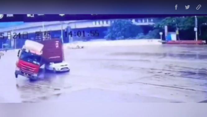 Tình huống giao thông: Đang chạy trên đường quốc lộ 324 thuộc thành phố Nam An, tỉnh Phúc Kiến, hôm 24/5, ôtô con màu trắng rẽ ngoặt sang làn bên phải về hướng trạm xăng. Ngay phía sau, một xe container lao tới, trong khi mặt đường trơn trượt vì trời mưa, và tài xế phải đánh lái tránh va chạm. Thùng container phía sau mất trọng tâm rơi xuống và đè trúng ôtô con.
