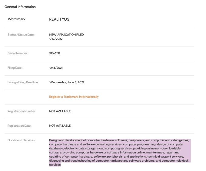 Theo The Verge, Parker Ortolani, Giám đốc cấp phép nhãn hiệu tại Vox Media, nói Apple có thể tiết lộ hoặc đề cập đến hệ điều hành mới tại sự kiện WWDCC 2022 tuần sau. Hãng được cho là không trực tiếp đăng ký nhãn hiệu realityOS mà sử dụng công ty vỏ bọc có tên Realityo Systems. Đơn đệ trình ban đầu được nộp vào tháng 12/2021 và thời hạn cuối để gia hạn hồ sơ là ngảy 8/6 - hai ngày sau bài phát biểu quan trọng của Apple tại WWDC 2022.