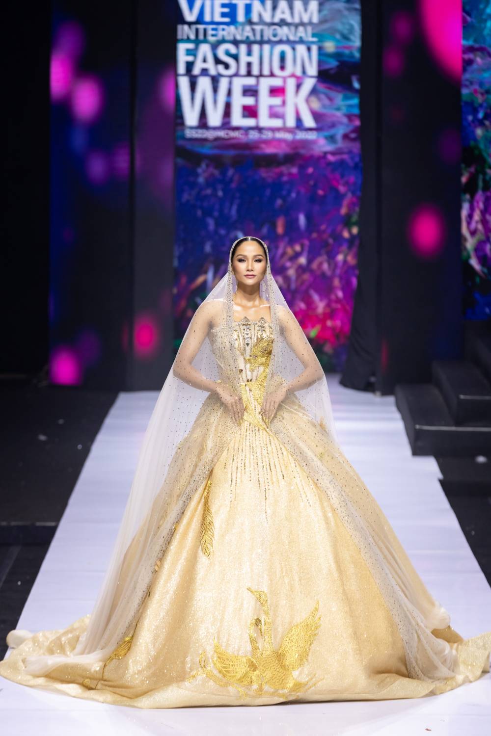 Với trang phục đương đại, cách phối 2 màu ombre được sử dụng nhuần nhuyễn, mang lại hiệu ứng thị giác mãn nhãn. Trong khi đó, những trang phục "đinh" của bộ sưu tập được sử dụng màu gold chủ đạo, đây là màu sắc signature của nhà thiết kế. Và, người thể hiện mẫu váy này là hoa hậu H'Hen Niê.