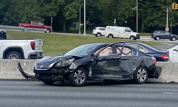 Một chiếc Range Rover rơi khỏi xe tải, văng trúng một chiếc Honda Accord khiến cả hai xe dập móp, hư hỏng nặng, hôm 23/6 ở New Jersey.