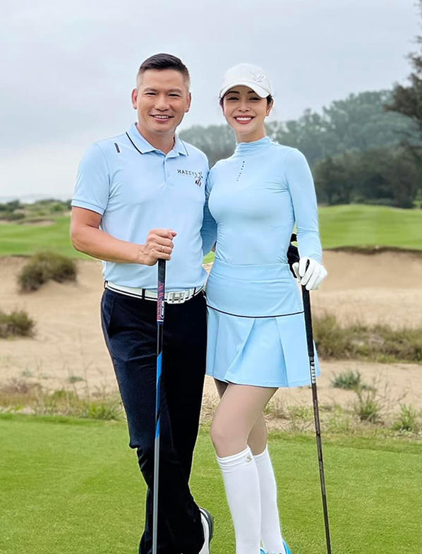 Jennifer Phạm thường cùng chồng - doanh nhân Đức Hải (trái) đánh golf, rèn tính kiên trì, giảm căng thẳng và nâng cao sức khỏe. Jennifer Phạm chuộng mix áo polo cùng chân váy mini chất liệu co giãn thoải mái, ôm sát cơ thể.