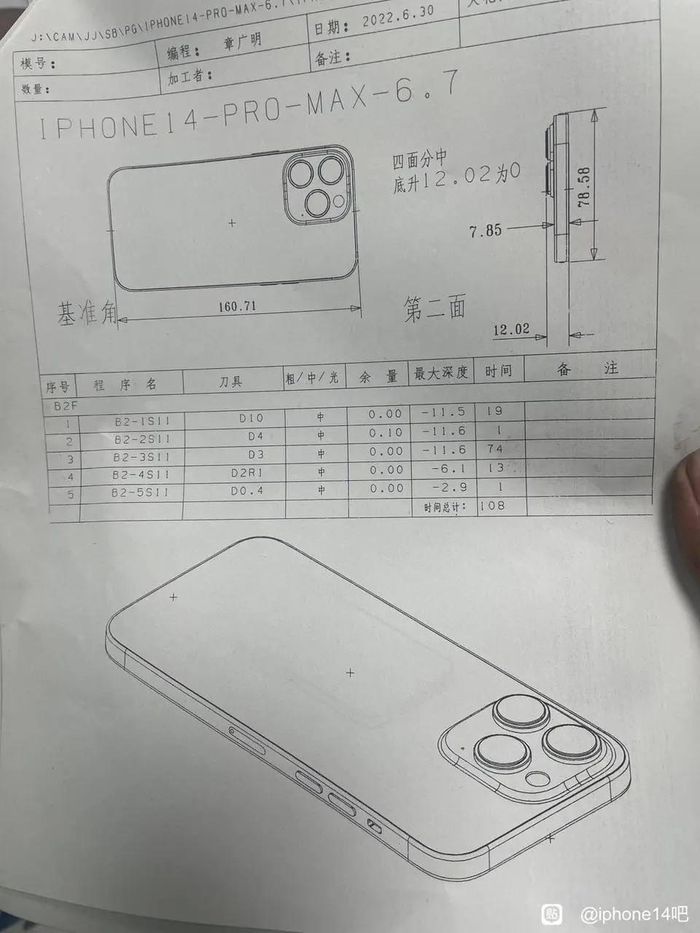 Theo trang AppleInsider, một bản thiết kế trên giấy được chia sẻ qua Baidu và đăng lại trên Twitter, cho thấy thiết kế chi tiết của thiết bị có tên "iPhone 14 Pro Max". Các kích thước của thiết bị được in rõ ràng và nó cho thấy độ dày của chiếc iPhone mới tăng lên một chút so với iPhone 13 Pro Max.