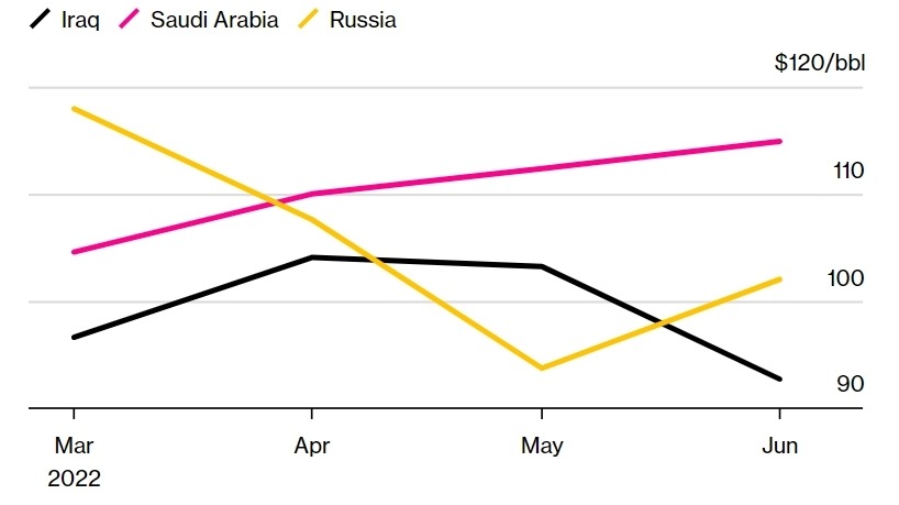 Dù khoảng cách giữa dầu Nga và dầu Saudi Arabia đã thu hẹp trong tháng 6, chênh lệch vẫn quanh 13 USD một thùng. Tính trung bình, giá dầu Nga bán sang Saudi Arabia trong tháng 6 là 102 USD.