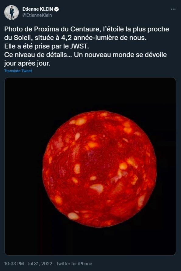 Trong bài đăng hôm 31/7 của mình, ông Étienne Klein đăng trên Twitter cá nhân bức ảnh một vật thể tròn đỏ to tướng, kèm dòng trạng thái nói rằng đây là hình ảnh Proxima Centauri, ngôi sao gần Mặt Trời nhất mà ta biết, được chụp bởi chính Kính viễn vọng Không gian James Webb. Ông còn viết: "Độ chi tiết chưa từng... Một thế giới mới được mở ra mỗi ngày".