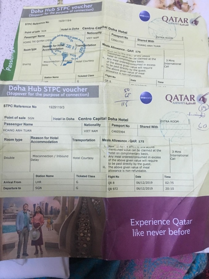 Chị Hoàng Thị Quỳnh Uyên, 38 tuổi, làm dịch vụ visa ở TP HCM, có chuyến đi Anh cùng chồng tháng 12/2019. Họ đặt vé qua một công ty du lịch, bay của hãng Qatar Airways. Sau lượt đi suôn sẻ, ở lượt về họ quá cảnh ở Qatar và bị delay chuyến về TP HCM tới 14 tiếng.