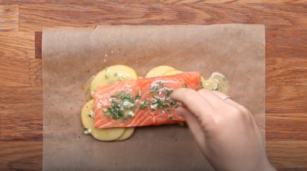 Bước 4: Đặt cá hồi lên trên khoai tây, rưới phần hỗn hợp còn lại lên và nêm nếm hương vị cho vừa ăn.