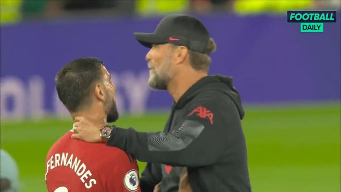 HLV Klopp đã bóp cổ Fernandes sau trận Liverpool để thua MU. Dù chiến lược gia người Đức giải thích đây là 'một hành động bình thường' nhưng vẫn không thể giấu được vẻ bực tức vì những pha câu giờ của đội trưởng bên phía đội chủ nhà.