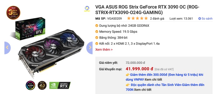 Trong nửa đầu tháng 9, các hệ thống bán lẻ card đồ họa tiếp tục điều chỉnh giá cho các model từ phổ thông đến cao cấp. Ví dụ, mẫu Asus ROG Strix GeForce RTX 3090 OC Edition 24GB từng có giá niêm yết 72 triệu đồng đầu năm nay, giờ còn 42 triệu đồng. So với lần điều chỉnh giá cuối tháng 3, thiết bị đang được giảm thêm hơn chục triệu đồng.