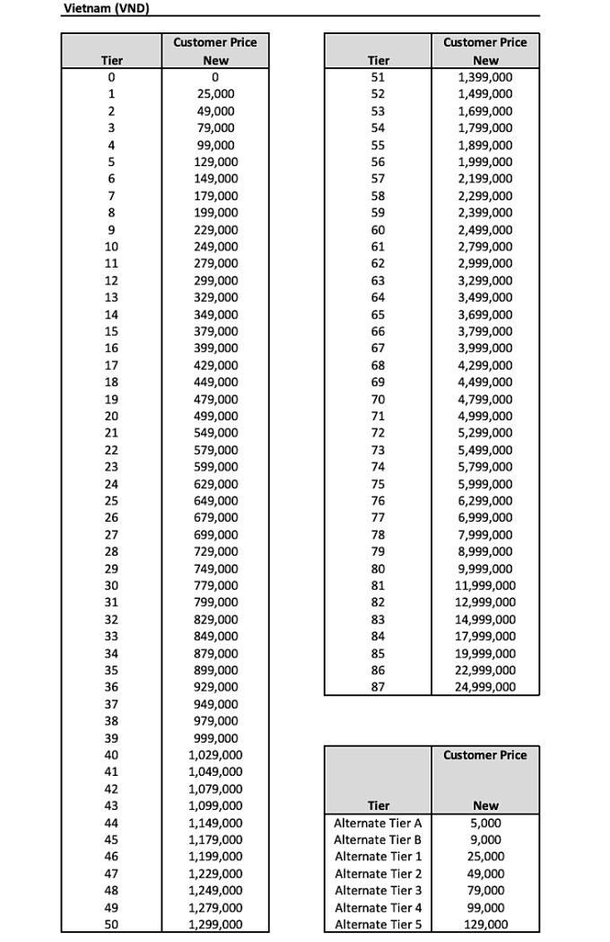 Theo phụ lục hướng dẫn của Apple, mức giá mới trên App Store sẽ được chia làm 87 bậc. Bậc 0 là các ứng dụng miễn phí, tức không thu tiền người dùng. Những ứng dụng thuộc bậc 1 sẽ cộng thêm 25 nghìn đồng. Cấp cao nhất là 87 tăng 24,9 triệu đồng.