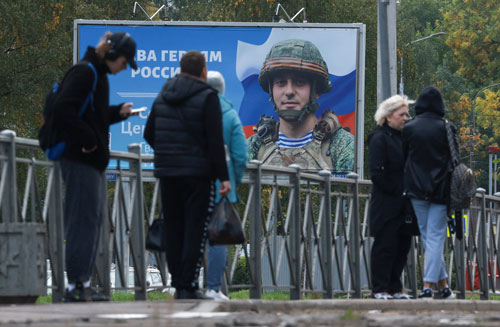 Người dân tập trung tại một trạm dừng xe điện trước tấm biển chân dung của thành viên quân sự Nga ở TP Saint Petersburg, Nga hôm 21-9 Ảnh: REUTERS