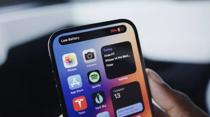 Cảnh báo pin yếu ở khu vực Dynamic Island trên iPhone 14 Pro Max. Ảnh: MKBHD