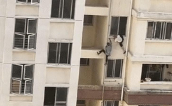Ngay khi phát hiện sự việc, một người đàn ông lập tức dùng tay không leo lên tầng 4 tòa nhà theo đường ống nước. Sau khi thành công tiếp cận cụ già đang cố bám víu vào thành cửa sổ, người đàn ông nhanh chóng kéo cụ già vào bên trong căn hộ một cách an toàn.
