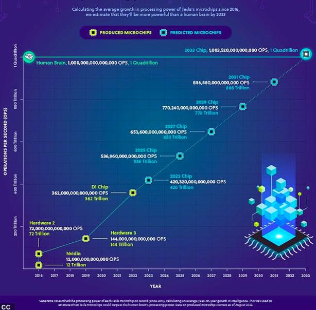 Do đó theo Vanarama, dự kiến vào năm 2033, con chip dùng trên xe Tesla sẽ có thể vượt qua khả năng xử lý của não bộ con người với khoảng chênh lệch 3.520 tỷ tác vụ trong mỗi giây.