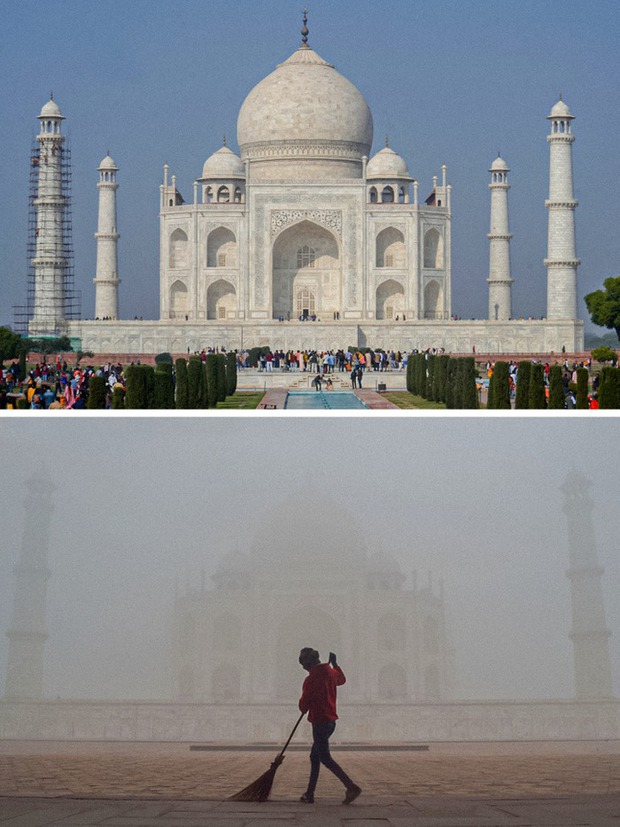 Taj Mahal là địa điểm du lịch biểu tượng của Ấn Độ. Gần đây, sương mù dày đang bao phủ nơi này, khiến nó gần như không thể nhìn thấy khi đứng ở xa. Tình trạng ô nhiễm cũng khiến đá cẩm thạch trắng của cung điện chuyển sang màu vàng.