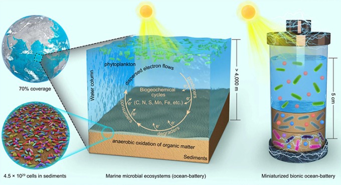 "Pin đại dương sinh học thu nhỏ được lấy cảm hứng từ các hệ sinh thái vi sinh vật biển", tác giả chính Zhu Huawei từ Phòng thí nghiệm Trọng điểm Nhà nước Trung Quốc về Tài nguyên Vi sinh vật, cho biết.