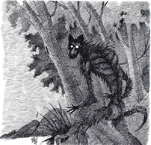 Nó nhanh chóng nhảy lên cây trước sự ngỡ ngàng của nhiều người, độ cao của cú nhảy này lên tới 4m. Theo mô tả, sinh vật này có lông màu trắng bạc và xám, cùng lớp lông bờm dày, khuôn mặt giống khỉ đầu chó nhưng kích thước cơ thể lớn hơn nhiều, dài gần 2m.