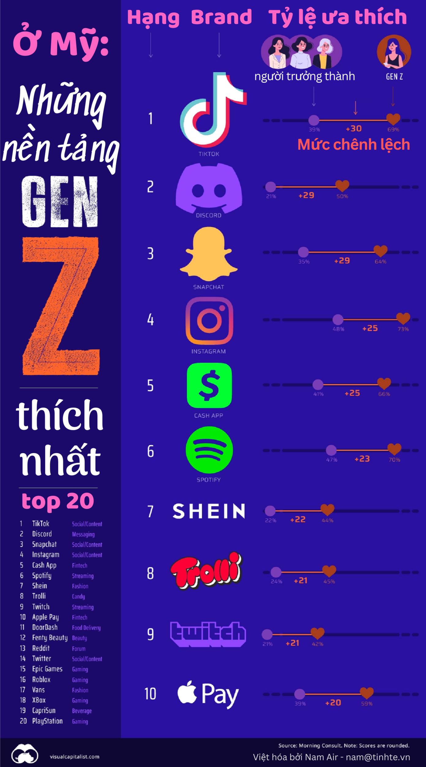 Trong số 20 nền tảng và ứng dụng được ưa thích nhất ở Mỹ thì Gen Z nước này thích Tiktok nhất, lên tới 69%, tức là hơn ⅔,.
