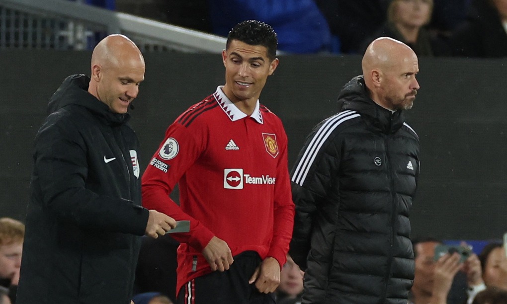 Ten Hag (phải) khi Ronaldo vào sân ở trận gặp Everton trên sân Goodison Park hôm 9/10/2022. Đó cũng là trận duy nhất CR7 ghi bàn ở Ngoại hạng Anh mùa này. Ảnh: Reuters