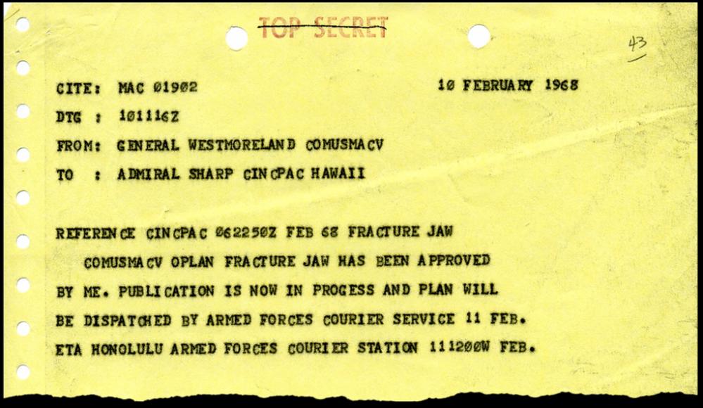 Tới ngày 12/2/1968, trong bức điện khẩn gửi Tướng Westmoreland kèm một bản sao tới Tướng Wheeler, Đô đốc Sharp nhấn mạnh: “Ngừng tất cả kế hoạch “Vỡ hàm”. Tất cả các nhân viên có quyền truy cập vào kế hoạch này không được tiết lộ nội dung kế hoạch và phải hiểu được rằng kế hoạch hoặc là tiếp tục hoặc là bị tạm ngưng”. Ông này đồng thời yêu cầu đưa tất cả các tài liệu về kế hoạch, bao gồm các tin nhắn và thư từ liên quan ở dạng bảo mật tuyệt đối.