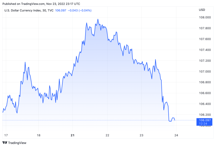 6h15 ngày 24/11 (giờ Việt Nam), chỉ số US Dollar Index (DXY) đo lường biến động của USD với rổ 6 đồng tiền chủ chốt (EUR, JPY, GBP, CAD, SEK, CHF) đứng ở mức 106,1 điểm, giảm 1,13 điểm, tương đương 1,05%.