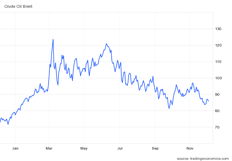 Theo dữ liệu của Trading Economics tối 4/12 (theo giờ Việt Nam), giá dầu Brent chuẩn toàn cầu đã giảm 1,25% so với ngày trước đó xuống dưới ngưỡng 86 USD/thùng.